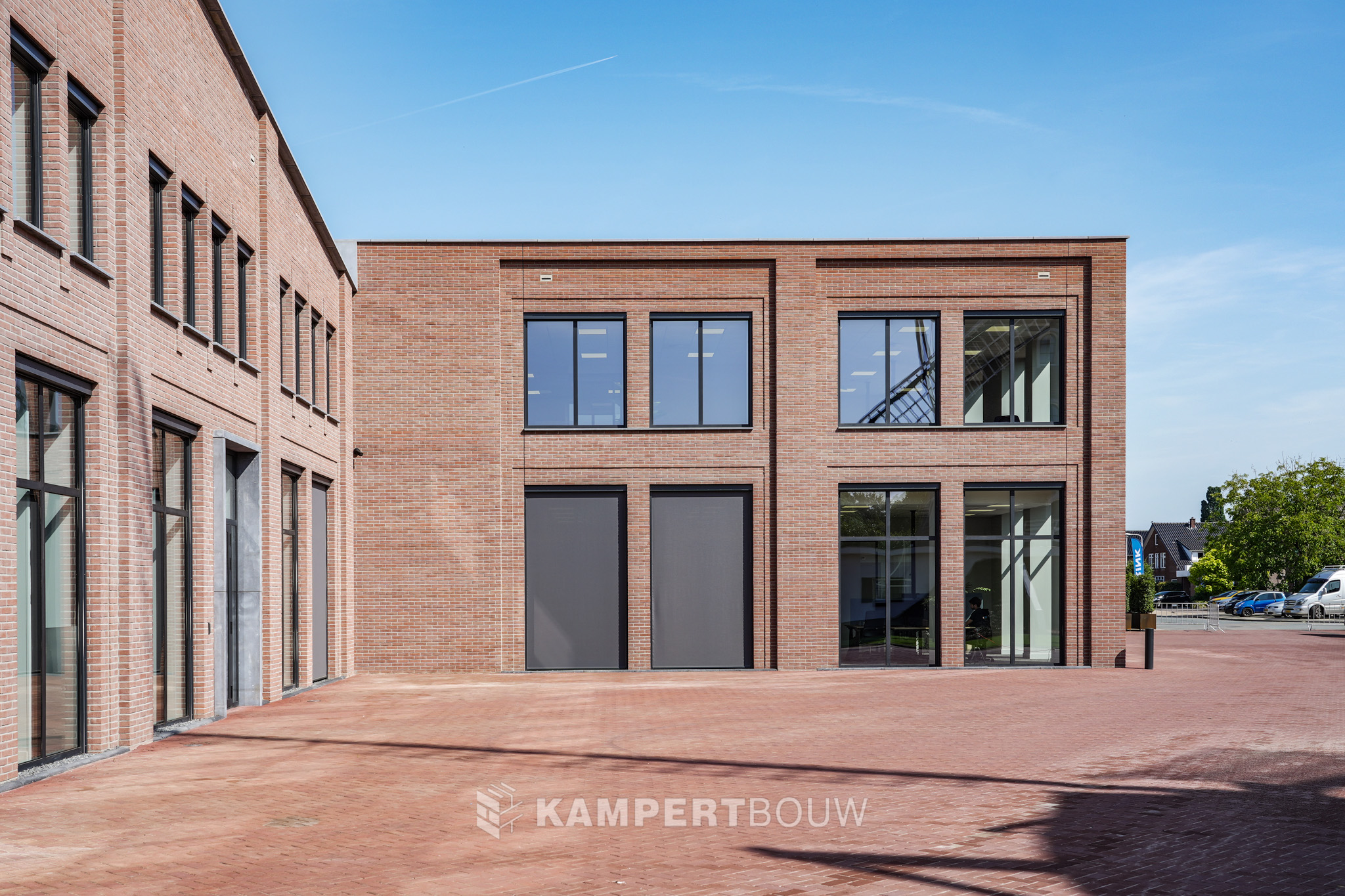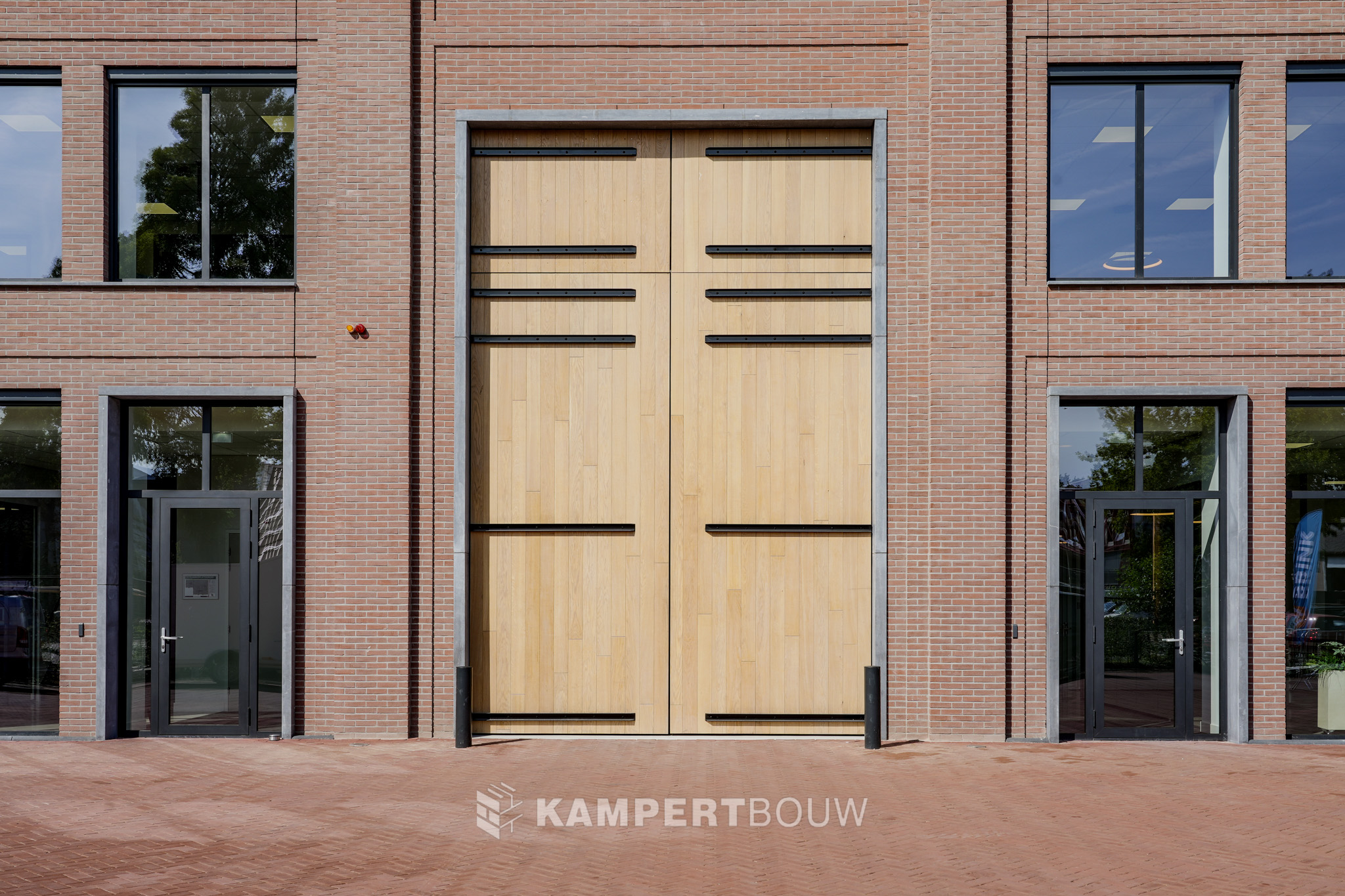 De voorgevel is een opvallend onderdeel van het ontwerp: aluminium kozijnen, siermetselwerk, hardstenen details en een natuurstenen logo geven het pand een herkenbare en stijlvolle uitstraling. Met hun indrukwekkende hoogte van vijf meter zijn de entreedeuren een echte blikvanger. De eikenhouten bekleding voegt een warm, ambachtelijk accent toe aan het industriële gevelbeeld. Verticale penanten en verfijnde metselwerkdetails zorgen voor een rijk ritme en diepte in de gevel.Functioneel interieur en klimaatbeheersing