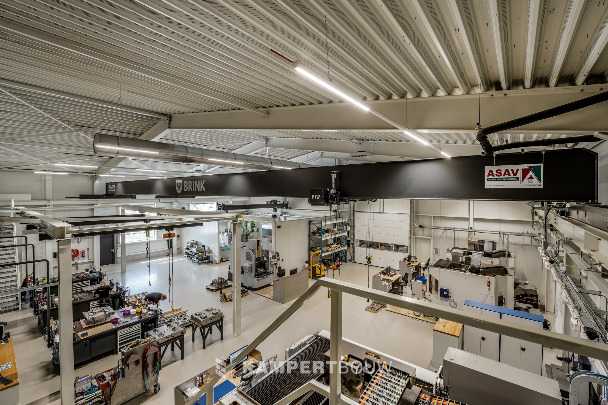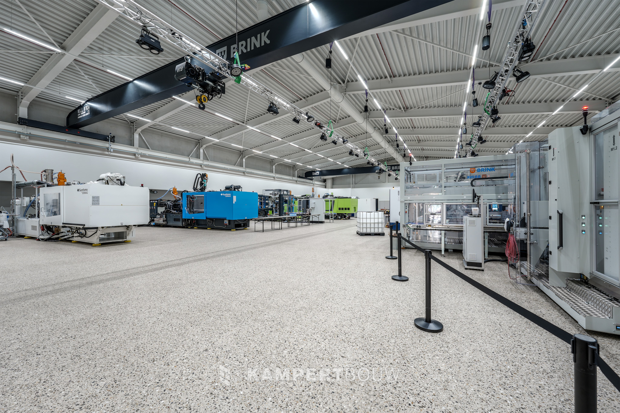 Ook binnen is de combinatie van functionaliteit en uitstraling duidelijk zichtbaar. De showroom is voorzien van een vlak geslepen betonvloer, ontworpen om het enorme gewicht van de aanwezige machines te dragen, zonder in te leveren op esthetiek. In de ruim 1.400 m² grote productiehal was temperatuurbeheersing essentieel. Samen met de installateurs ontwikkelden we een geavanceerd klimaatsysteem, een unieke, zware installatie die de temperatuur zeer stabiel houdt, essentieel voor de productieprocessen van Brink Moulds en Automation.Hoogwaardige afwerking en akoestiek