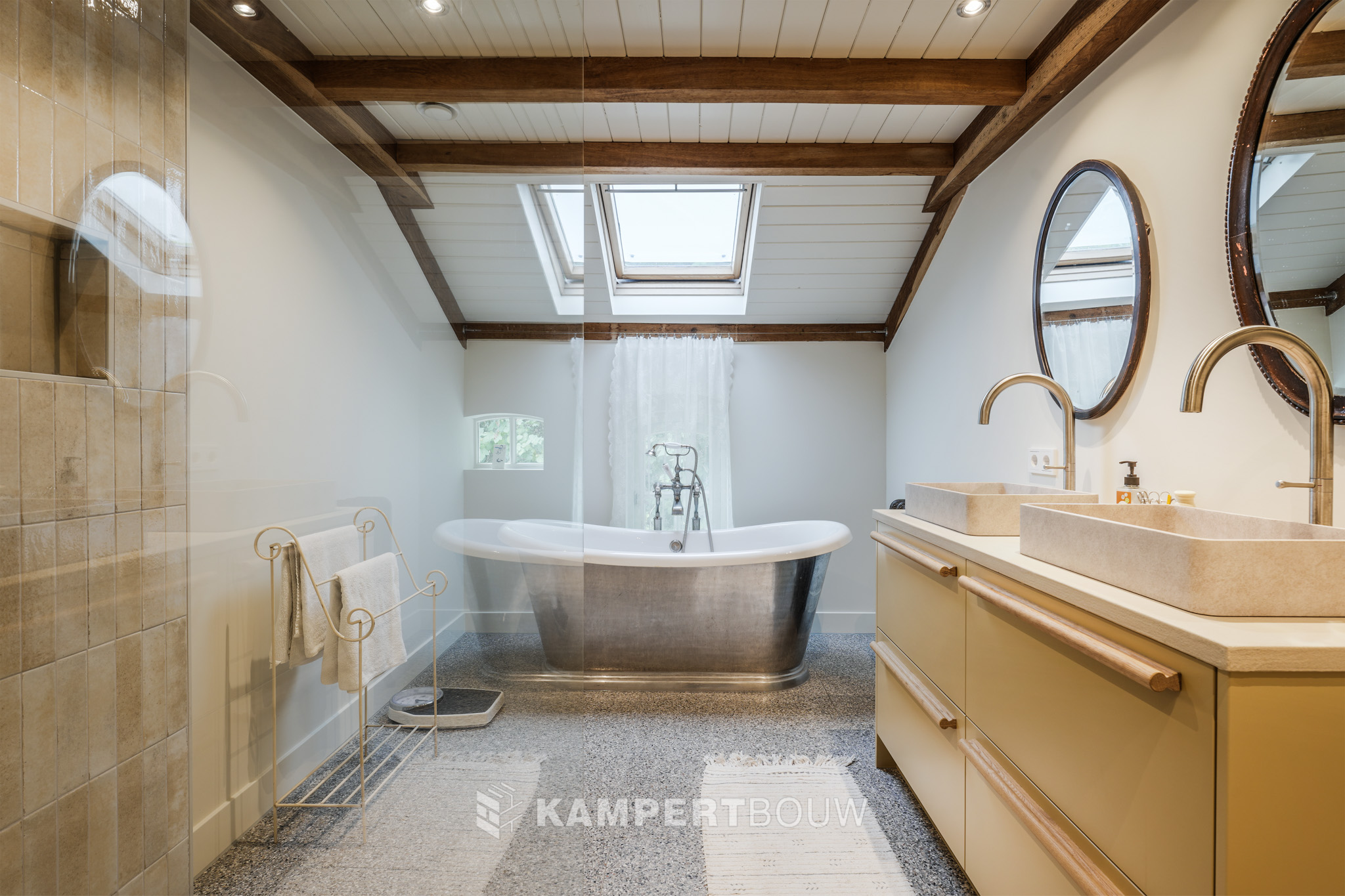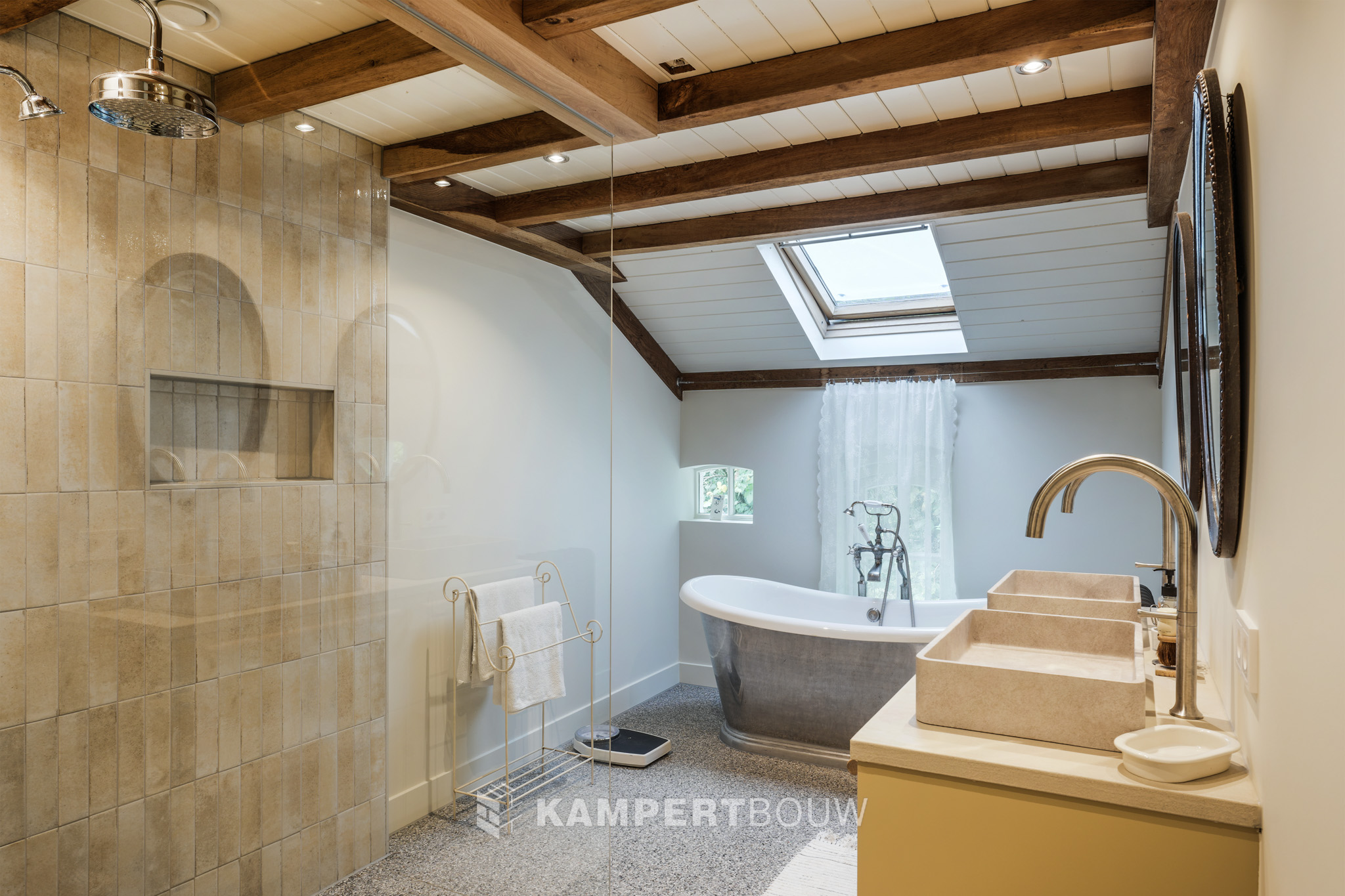 De badkamer is volledig vernieuwd, waarbij een deel van het bestaande sanitair, zoals het vrijstaande ligbad van gegoten ijzer, na demontage is opgeslagen voor hergebruik, duurzaam en doordacht. De ruimte kreeg een luxe, natuurlijke afwerking en is een echte blikvanger geworden. Het originele houten plafond geeft de badkamer veel karakter en charme. Rust en functionaliteit zijn hier helemaal in balans, waardoor de badkamer een fijne plek is om te ontspannen.Geborgen en stijlvol