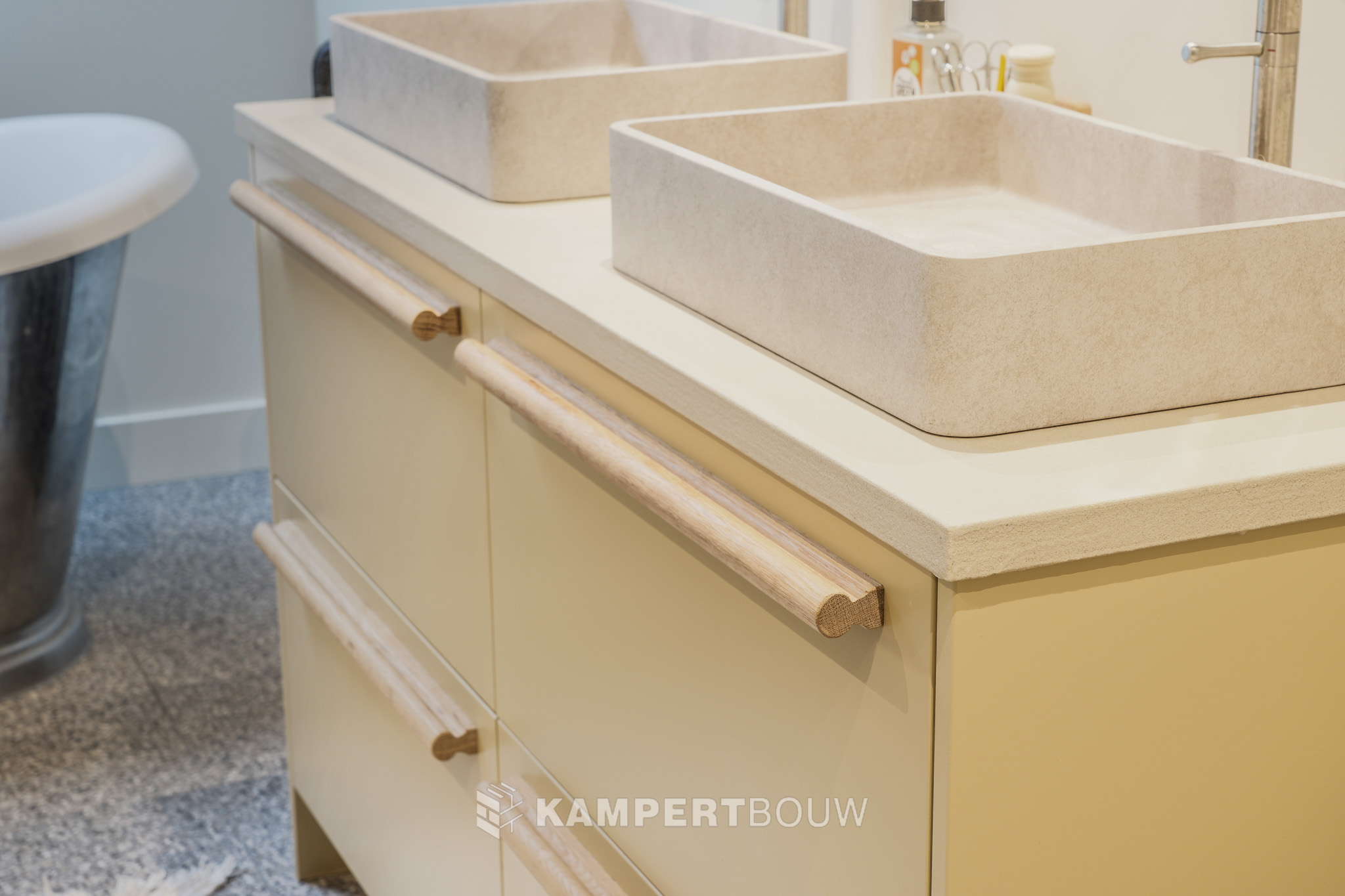 Om de woonboerderij echt eigen te maken, realiseerden we maatwerk in alle belangrijke vertrekken. In de keuken ontwierpen we een op maat gemaakte landelijke keuken met kookeiland, warme materialen en een slimme indeling, die koken en samenkomen bijzonder aangenaam maakt. Daar ontstond een gezellige zithoek rondom de houtkachel, die niet alleen warmte geeft, maar ook het hart van de woning vormt, een plek waar de landelijke charme volledig tot leven komt.Badkamer met karakter